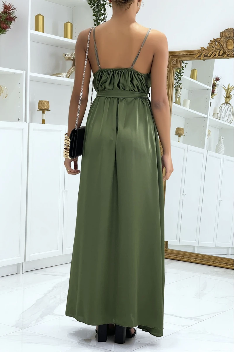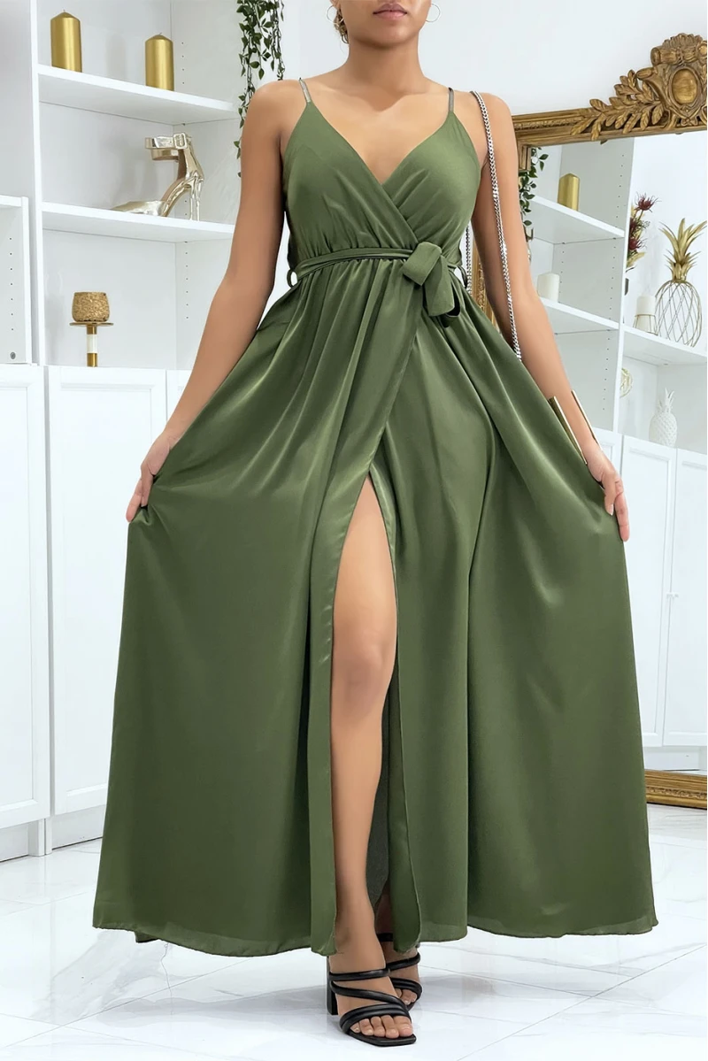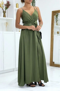 Longue robe satinée kaki croisé à bretelle. Robe femme très chic pour toutes occasions