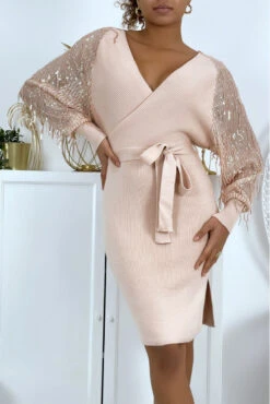 Robe cache-coeur beige à manches transparentes à sequins. Robe portefeuille en matière pull côtelé et manches bouffantes à paillettes, idéal pour les fêtes!