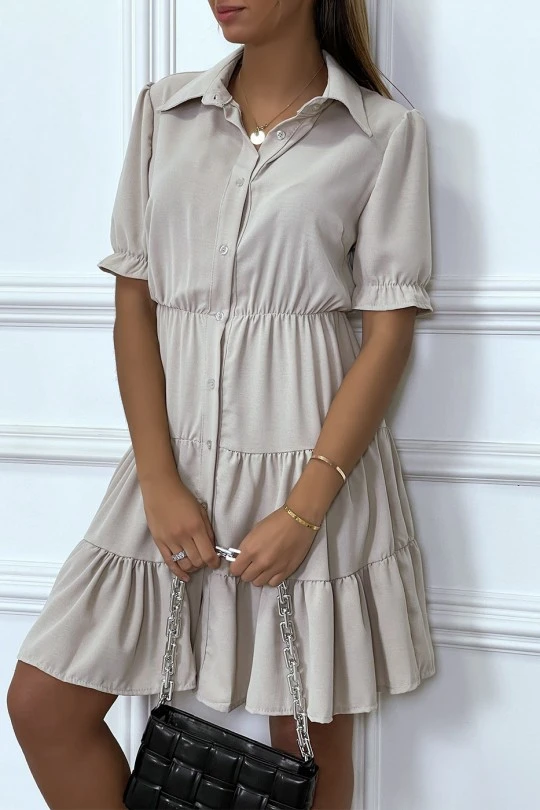 Robe chemise beige boutonnée avec volants. Robe très chic et très féminine pour l’été
