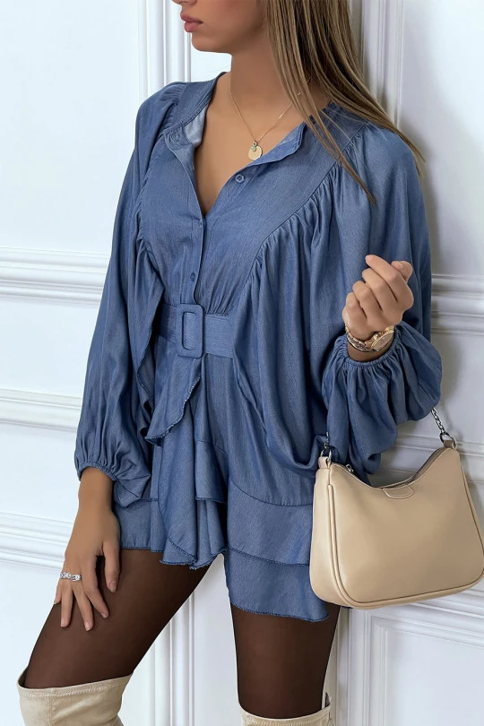 Robe chemise bleue à volants et manches chauve souris, très bouffante et ceinture, matière satinée