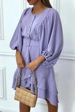 Robe chemise lila avec manches bouffante volants et ceinture. Robe chemise habillé très chic et tendance. Robe femme fashion
