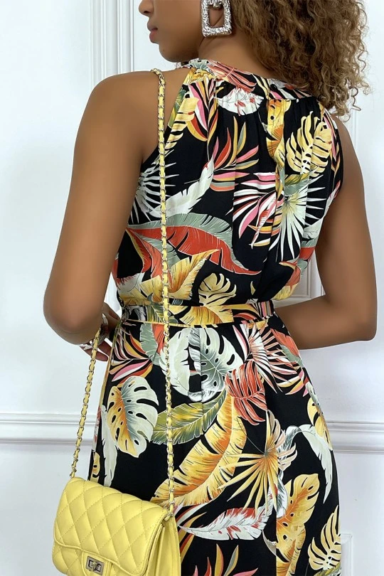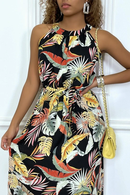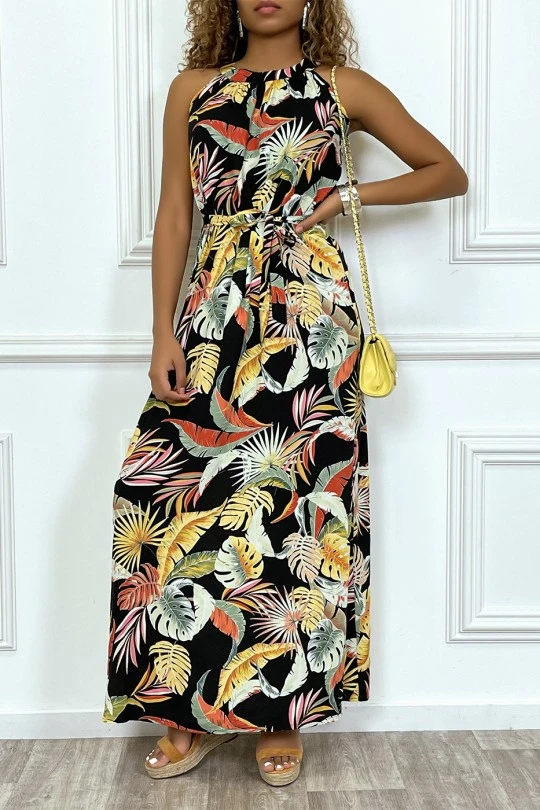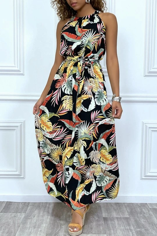 Robe longue noire avec imprimés floraux, à col rond sans manches. Idéale pour l’été cette tenue, vous fera vous sentir à l’aise et vous mettra en valeur.