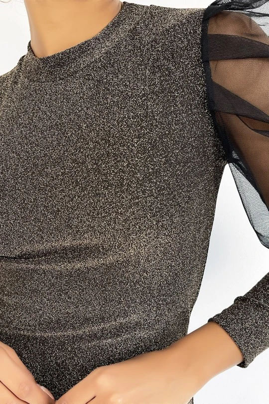 Robe moulante et brillante en doré avec manche bouffante en voile. Robe de soirée très tendance pour les fêtes de fin d’année