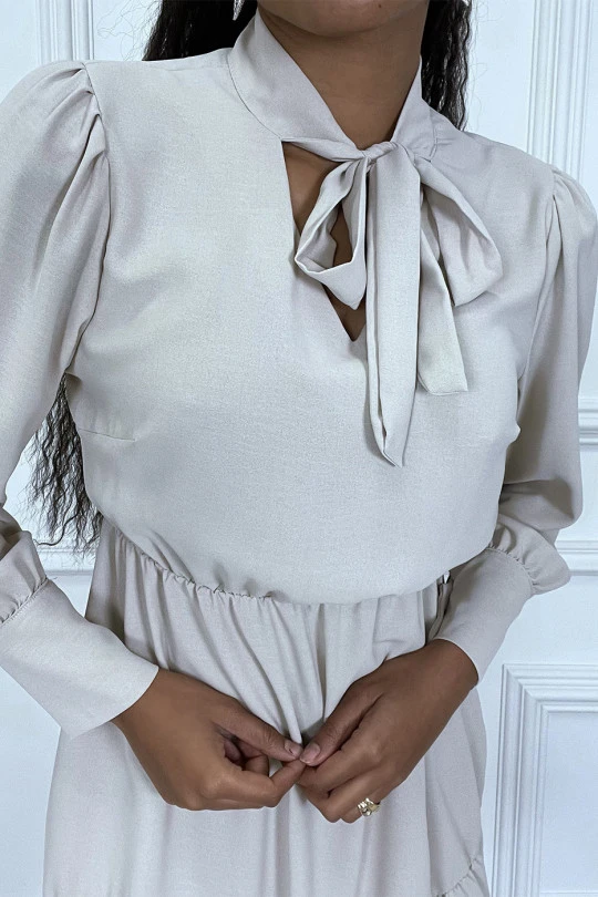 Robe patineuse beige à volant et noeud au cou, élastique à la taille