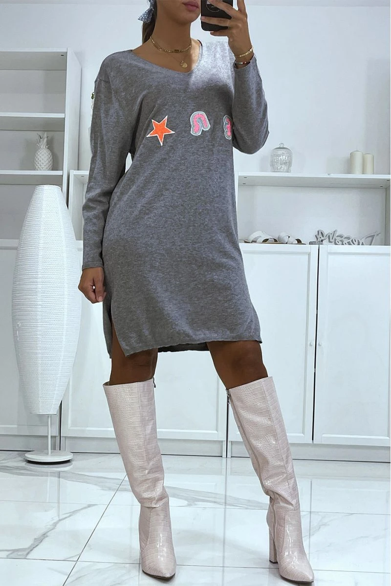 Robe pull anthracite pour femme en col V dans une matière très douce avec motif brodé. Robe pull femme tendance et pas cher