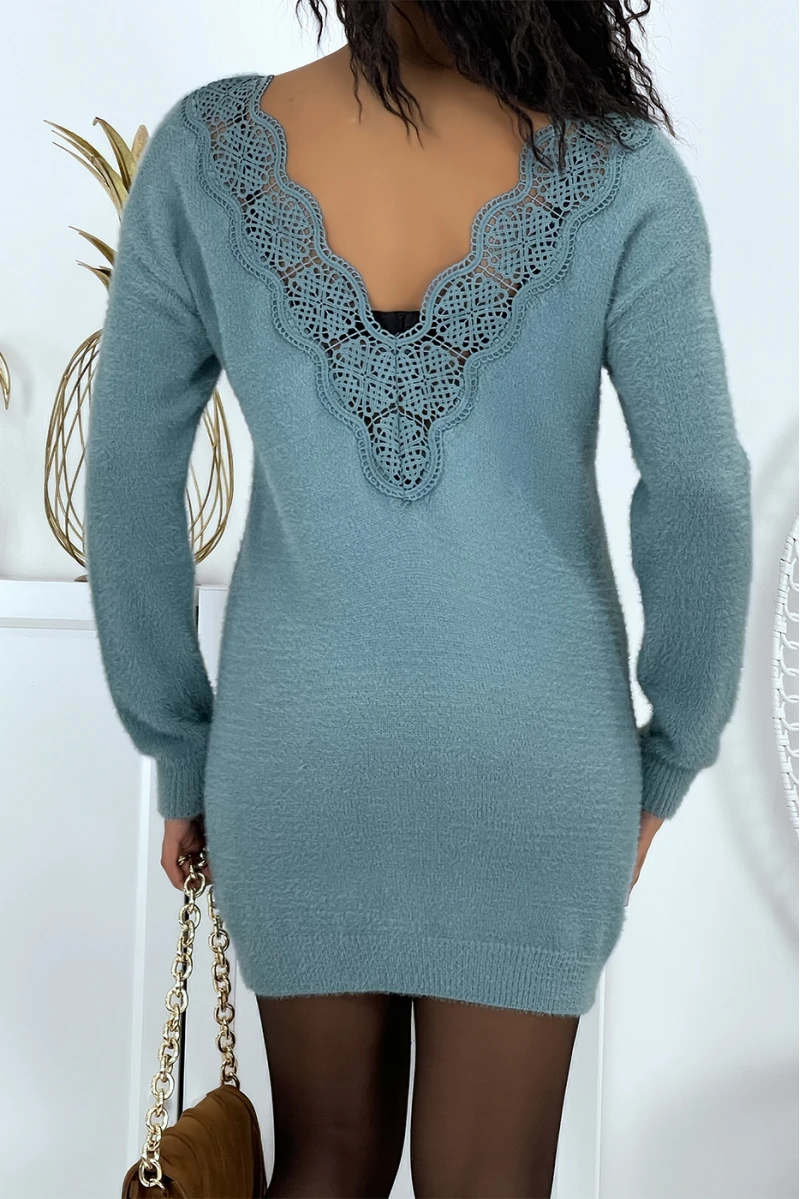 Robe pull duveteux bleu turquoise à dos nu en V et dentelle. Robe d’hiver moulante à manches longues chaude et confortable.