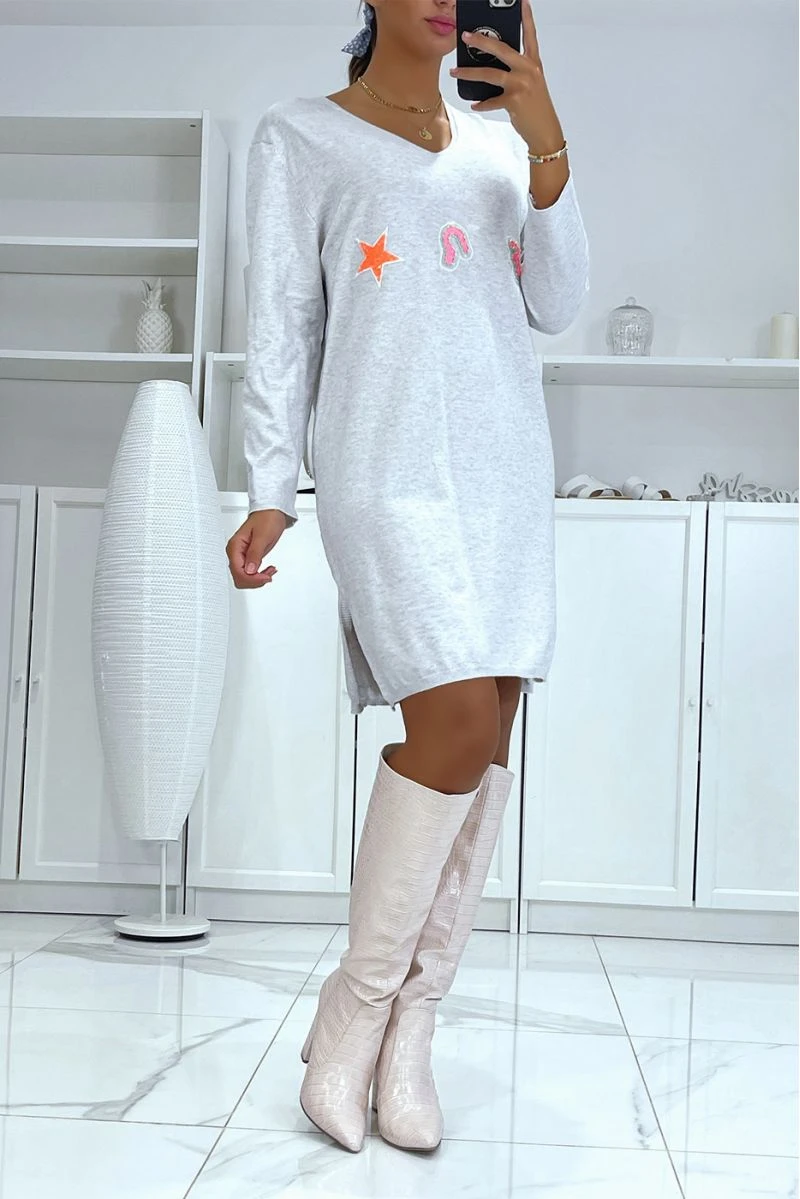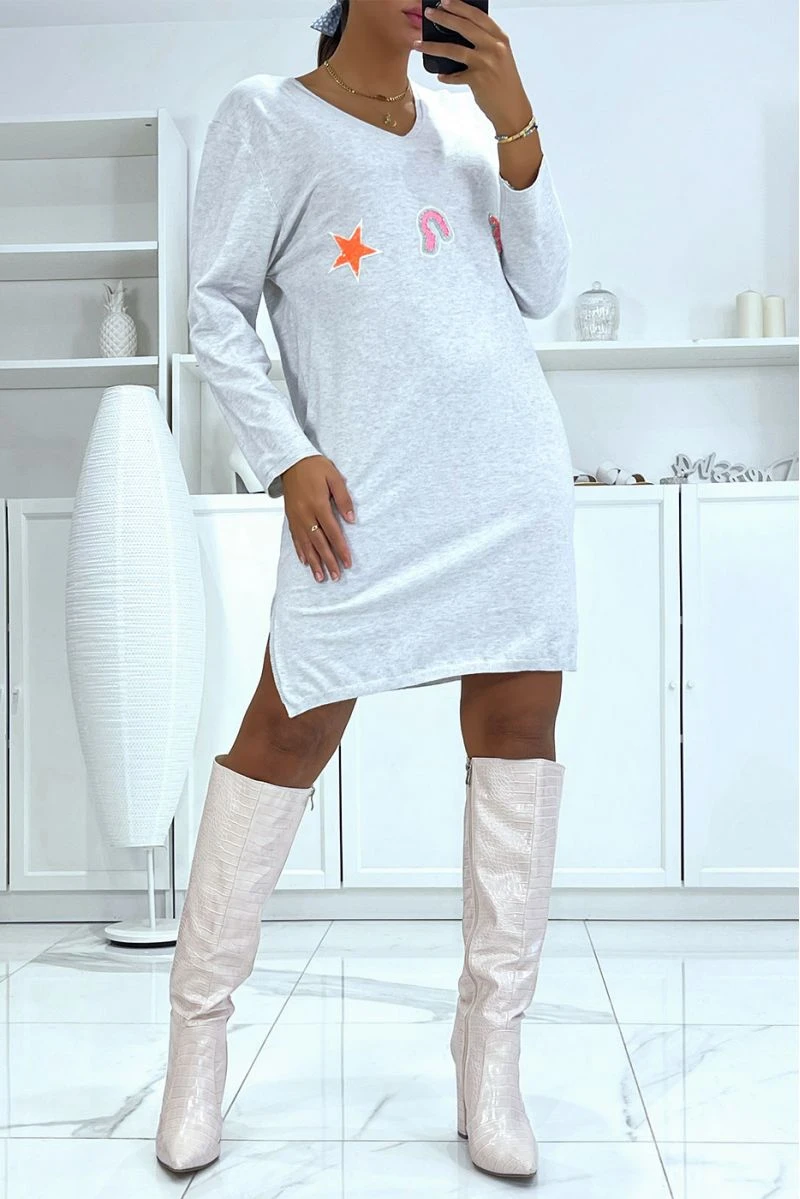 Robe pull grise pour femme en col V dans une matière très douce avec motif brodé. Robe pull femme tendance et pas cher