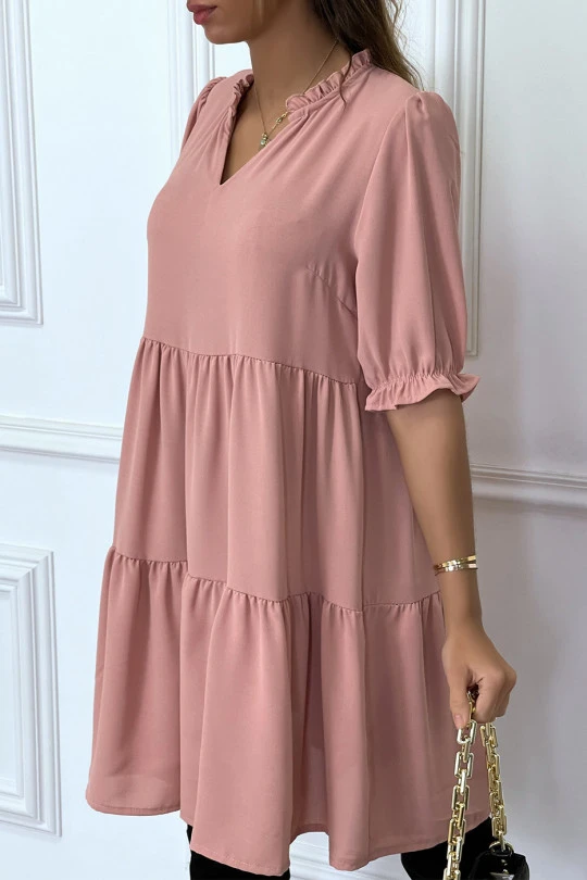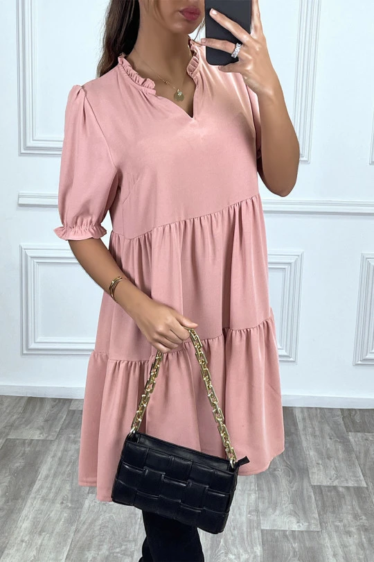 Robe tunique rose à volant à manches courtes, froncé sur 2 endroits