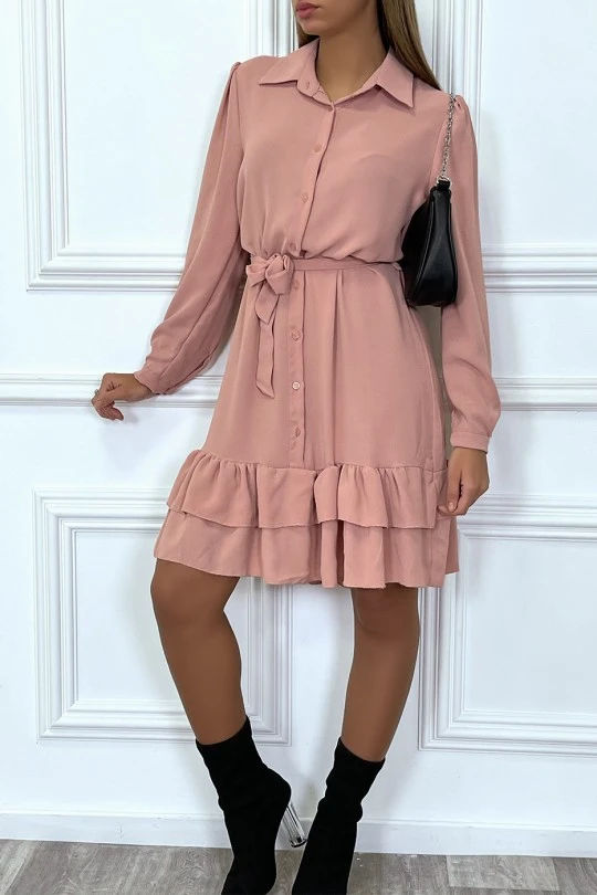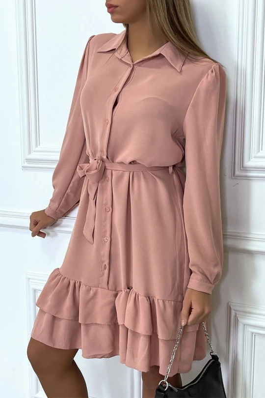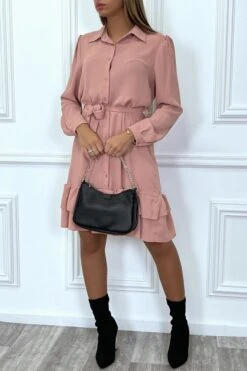 Robe tunique rose manches longues boutonné avec volant. Tunique femme très tendance boutons, volants et ceinture. Vêtement femme habillé